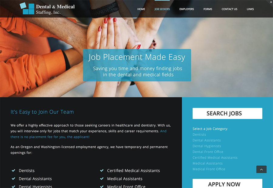 A staffing web site where applicants can check posted jobs by category, fill out a detailed application, and find needed documents and videos.